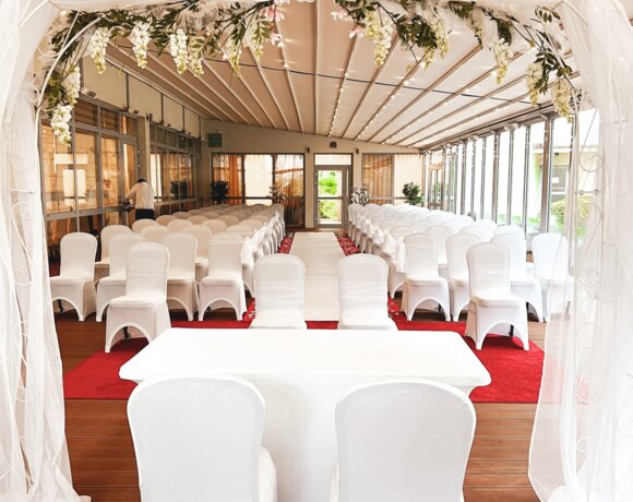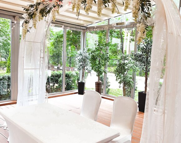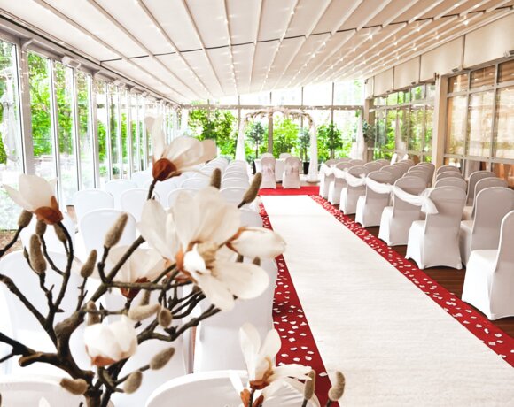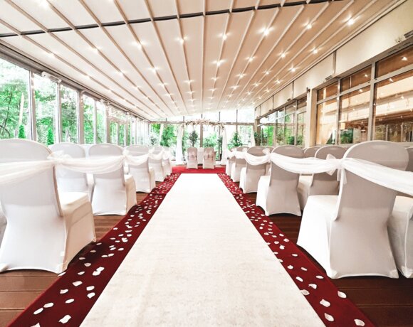 Wir haben die perfekten Orte für eine einzigartige Hochzeit. Wir können die Hochzeitszeremonie in einem grünen Garten, einem verglasten Teil des Restaurantsaals oder in einem Saal zur exklusiven Nutzung vorbereiten. Wir können den Zeremonienort gemäß unserem Standard oder gemäß Ihren individuellen Richtlinien vorbereiten.